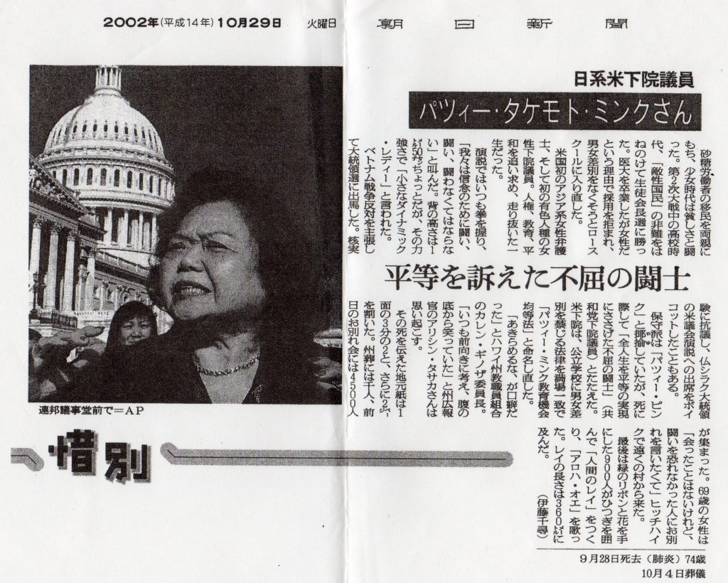 (注)新潟県立歴史博物館での展示(2002年10月12日~11月24日)直前、パッツィ・ミンクさんが亡くなっている。日本でもミンクさんの功績は広く報道され、展示会場でも以下の新聞記事コピーが置かれた。(浅海の無断引用になります。)