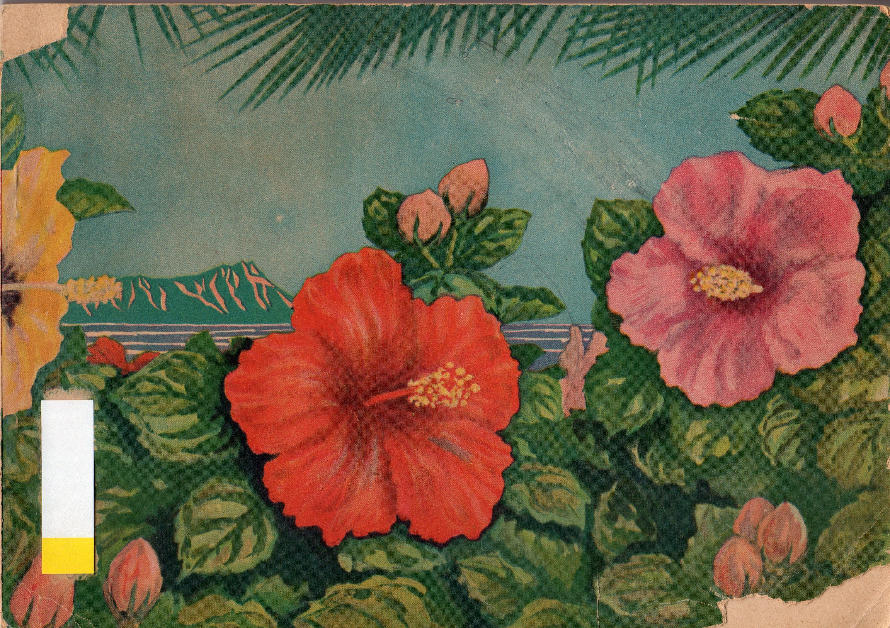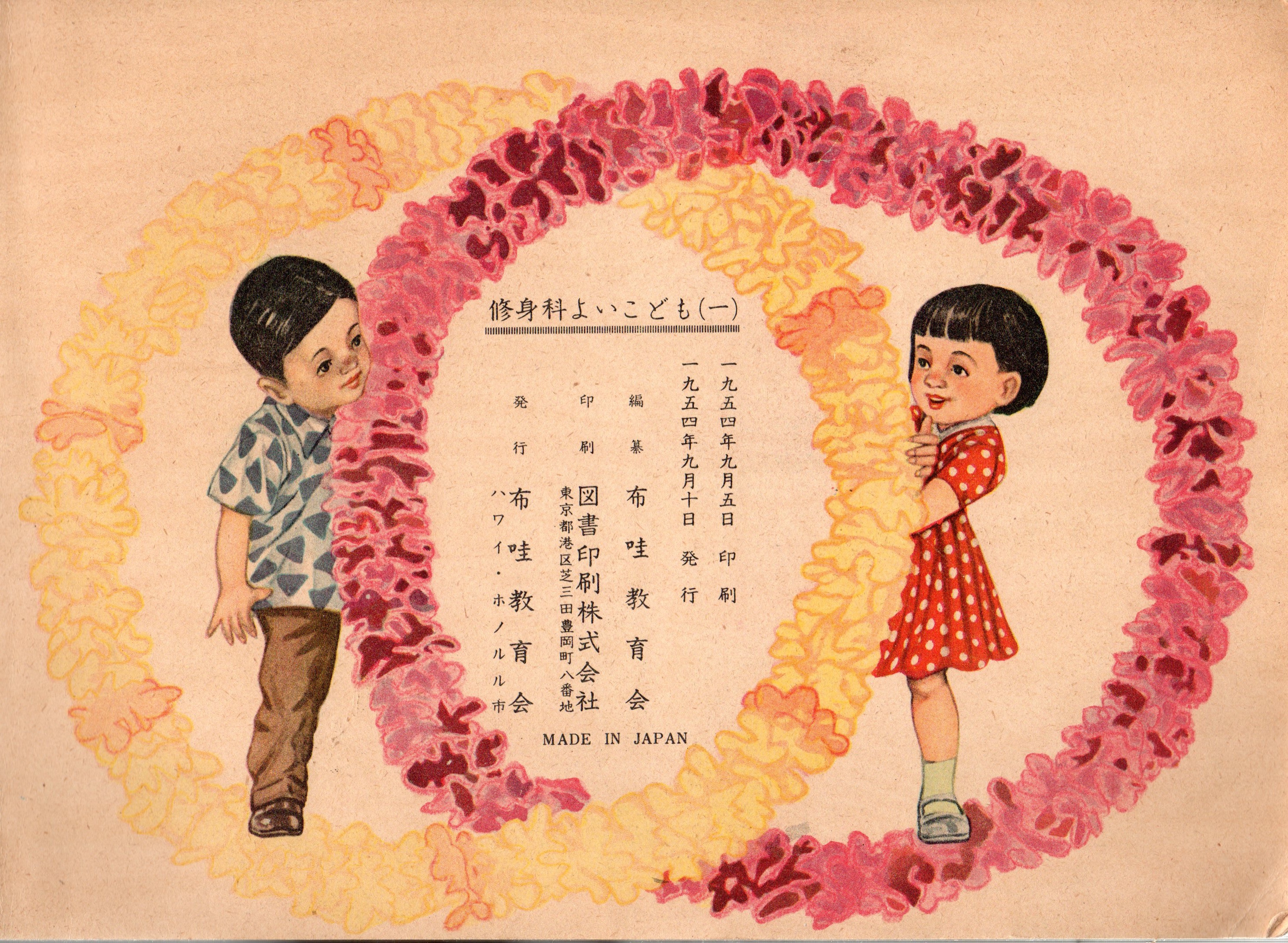 修身の教科書、「よいこども」。目次がもともとなかったのか欠損している。裏表紙にはハイビスカス、ダイヤモンドヘッドに名前の記入欄がある。実際に名前の記入がされていたが、付箋紙で隠した。戦後に日本語学校が再開して数年たっている。