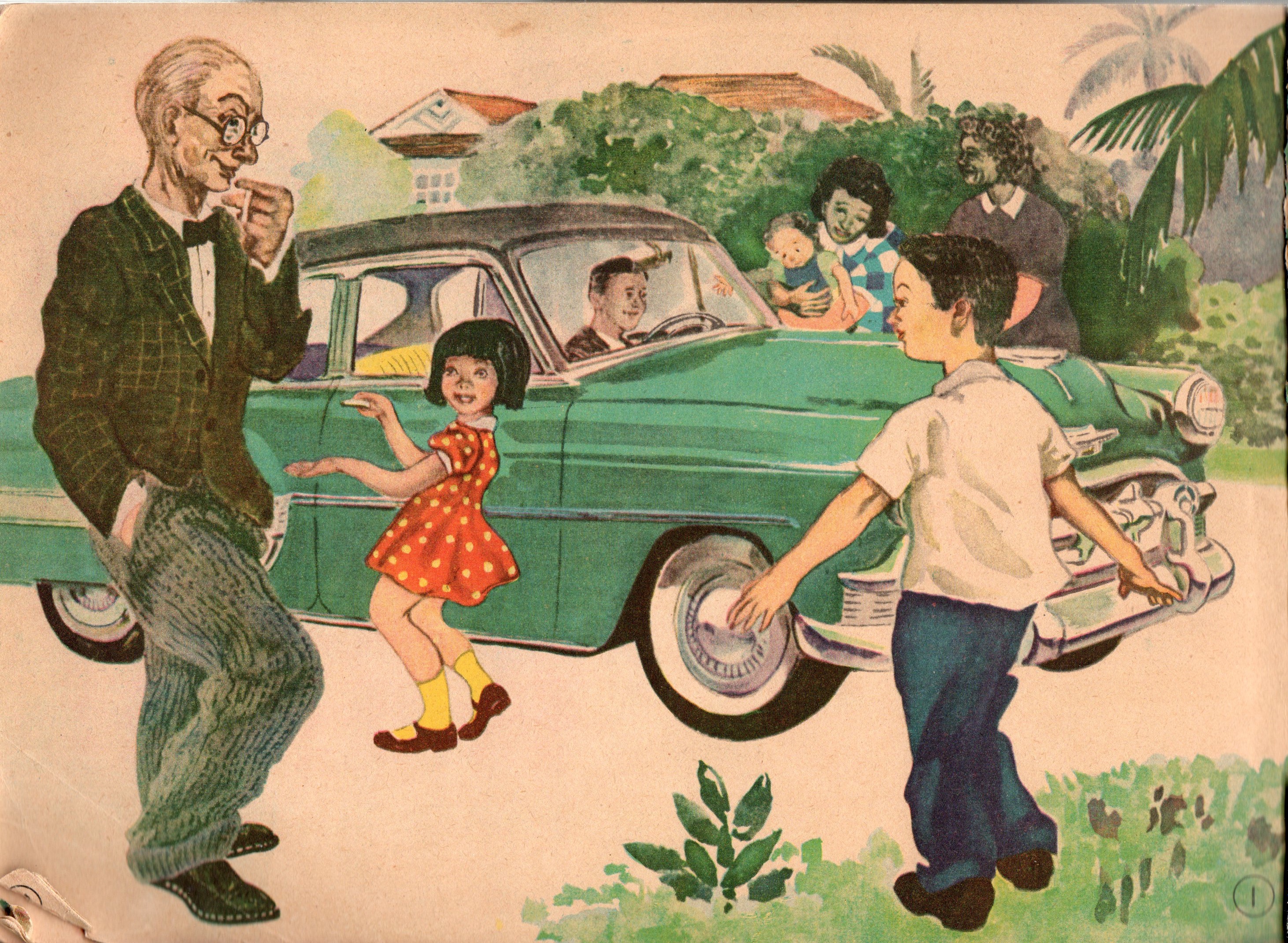 昔話、おとぎ話由来の絵以外はすべて上に象徴されるようにハワイの雰囲気に満ちている。生活描写にもアメリカナイズされた事物が使われている。通学用のバス、海岸でのピクニック、綺麗なダイニング等。もし日本で挿絵が用意されていたとしたら何人かの画家は当時の雑誌などを参考にいくぶん憧れめいたものを感じながら描いたのではなどど想像してみる。